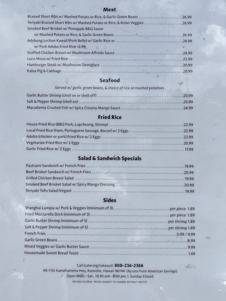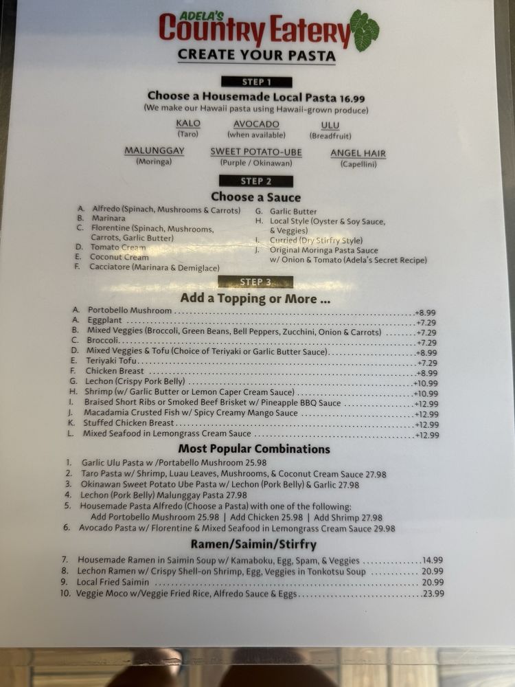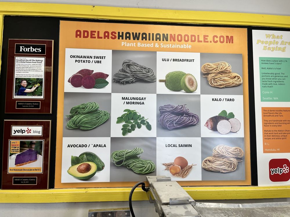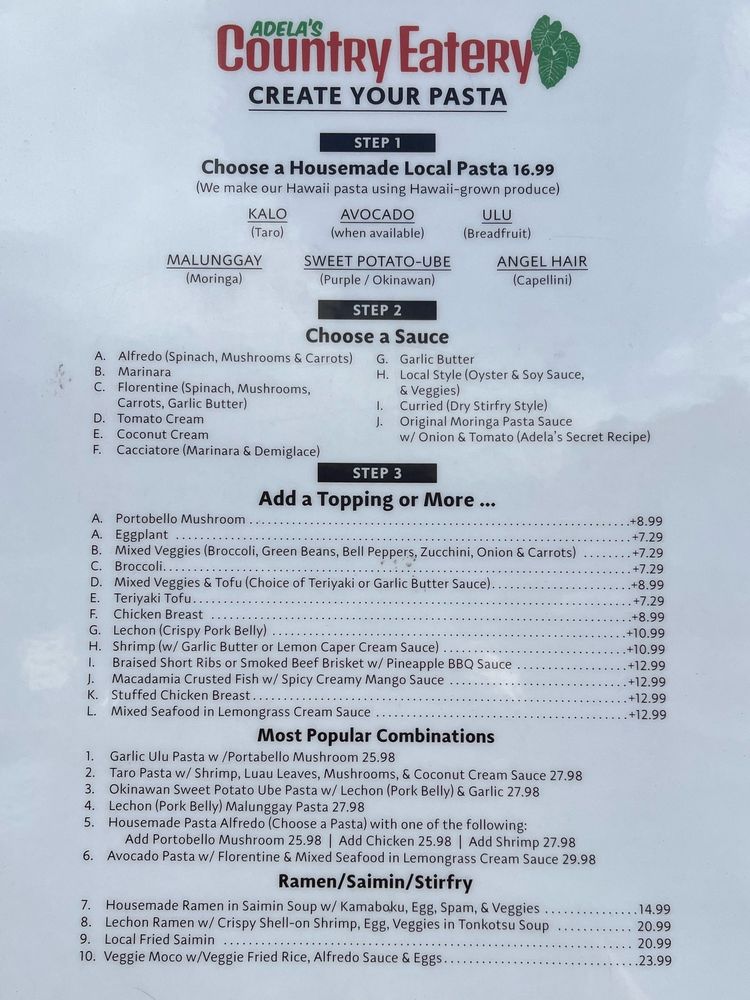 Adela’s Country Eatery, located in Kaneohe, HI, offers a unique dining experience with a focus on fresh, hand-crafted pasta dishes made from locally sourced ingredients. Customers rave about the variety of pasta options, from Ube pasta to Avocado Garlic noodles, all with generous portions and flavorful combinations. The friendly service, including personalized recommendations and thoughtful gestures, adds a special touch to the dining experience. With takeout-only service and a suggestion to enjoy meals at nearby parks or beaches, Adela's Country Eatery encourages customers to savor their delicious dishes in scenic settings. From the Lechon Malunggay noodle plate to the Braised Short Ribs, each dish showcases the creativity and dedication to sustainability of this Asian and women-owned establishment. Whether indulging in the decadent Ube cheesecake or savoring the umami flavors of their signature dishes, a visit to Adela's is sure to leave a lasting impression.